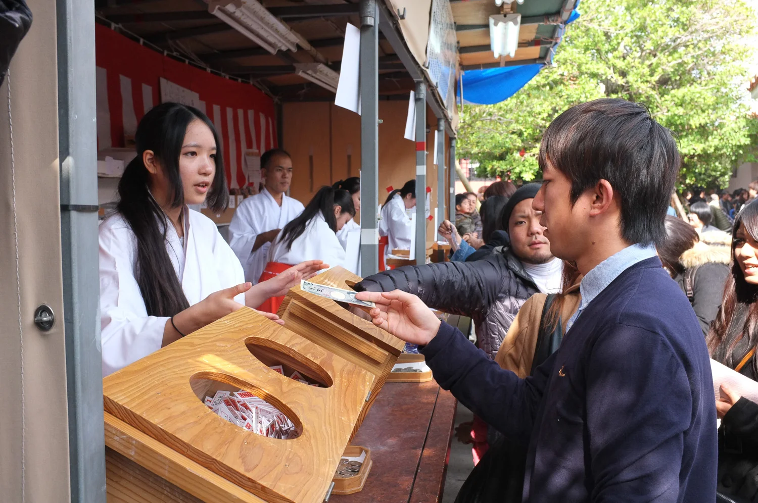 While at the shrine it's tradition to purchase Omikuji (Fortune-telling papers) said to predict how ones year will unfold. If the fortune is bad the paper is tied to a tree or line at the shrine in hope that bad fortune will stay there. Some however also believe in leaving the fortune papers even if it is good.